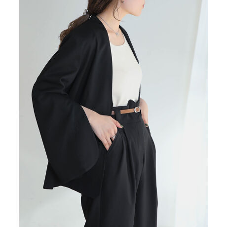 定番で使いやすいノーカラーデザインのジャケット。袖には深めのスリットを施し、レイヤードしているインナーがちらりと見える仕様に。ヒップラインが隠れる長めのシルエットで、カチッとしすぎず普段使いしやすい1枚です。着こなしによってはセレモニーシーンや通勤着にもオススメです。