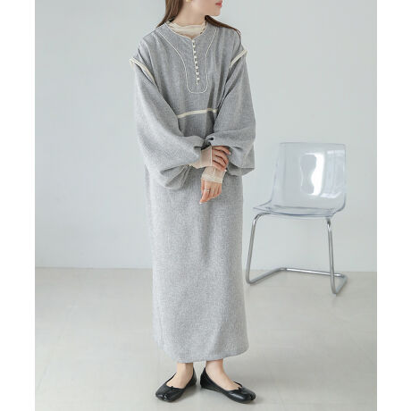 配色パイピングとクルミボタンのデザインが素敵なリラックスして着用できるIラインツイードワンピースです。ウエストは高めの位置でラウンドするように切り替えているのでスタイルアップも叶います。袖口にはゴムを施しているので、ボリューム袖の調節も簡単にしていただけます。