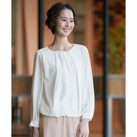 ■デザインジャケットを羽織った時にIラインゾーンを華やかにカバーする、タイの変形型デザインブラウスです。裾はバルーン型でボトムスの上から出しても決まる安心のデザインに仕上げました。