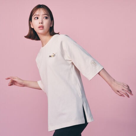 ビッグシルエットのTシャツ。おしりが隠れる丈、袖も長く肘が隠れます。カジュアルな着こなしに。