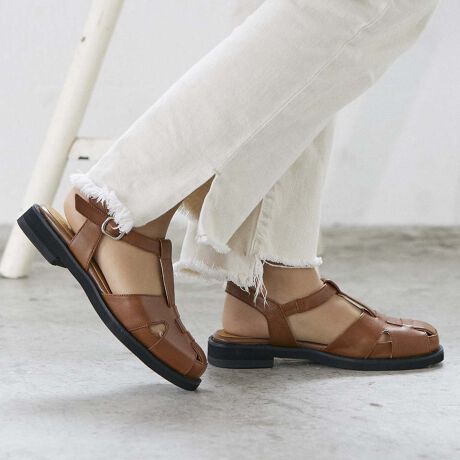 つま先を覆ったデザインに、サイドと踵の抜け感が合わさって、新しい印象のグルカサンダルに。