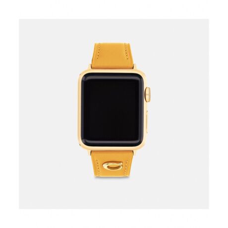 Apple Watch(R)の38mm/40mm/41mmに対応した、細身のレザー ストラップ。ゴールドトーンのハードウェアに、コーチのシグネチャー「C」がアイコニックな雰囲気。