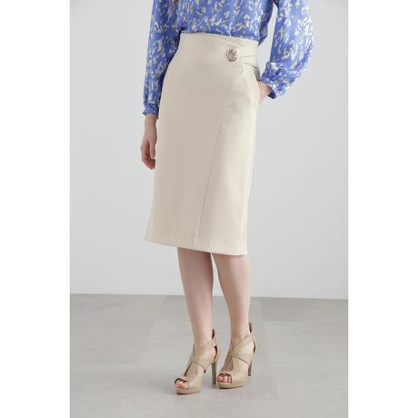 大きめのメタルのハトメが目を引くタイトスカート。ウエストサイドに挟み込んだ共生地を通したアシンメトリーなデザインがシャープなスカートです。大き目のハトメでアクセントを効かせた分、ウエストベルトなしでおなか回りはすっきりとした印象に。後ろ姿も、ダーツのみで無駄をそぎ落したデザインです。
