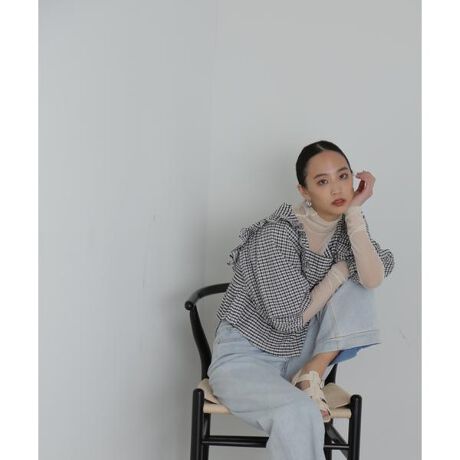 大きなラッフルフリルがフェミニンな印象のギンガムチェックブラウス。春夏気分をいっきに盛り上げてくれる、ギンガムチェックの楊柳シャーリング素材を使用。身頃は程よくゆったり目でカジュアルな雰囲気に仕上げています。肩フリルとペプラムデザインでメリハリの効いた女性らしいシルエットに。スクエアネックで首元はすっきりと抜け感をだしています。ボリュームスリーブの袖口にゴムをいれ、腕まくりをして袖丈をお好みで調節すると夏まで活躍できます。