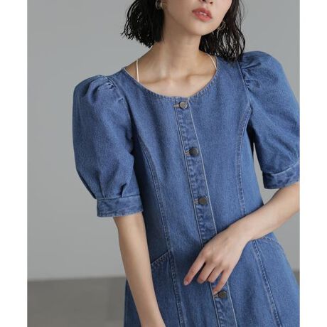 ボリュームスリーブが可愛らしいデニムワンピース。ウエストをシェイプし、シルエットが綺麗にでるミニ丈デザインはそのままに、今季はクルーネック&袖口カフスをつけてブラッシュアップ。ウエストをシェイプする位置を少し高めにしているので、小柄な方でもスタイルアップ見えを叶えます。今シーズンはデニムアイテムも注目されているので、一枚あるとトレンドを感じらる着こなしに。※モデルの着用画像の場合、光の当たり具合により、実際の色味と異なって見えることがございます。色味は、商品単体の画像をご参照ください。