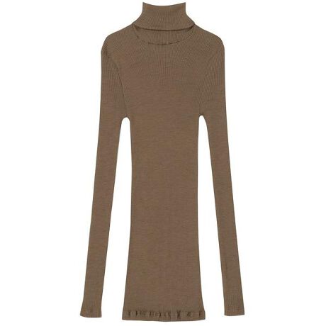 ウールとシルクをブレンドしたリブ編み素材を使ったフルスリーブのタートルネックのトップス。エレガントなカラー展開で、インナーとしてだけではなくアウターとしても活躍するアイテムです。ウールは、羊にやさしい飼育方法でつくられた“ノンミュールジングウール”を使用しています。※掲載サイズは輸入元サイズです。