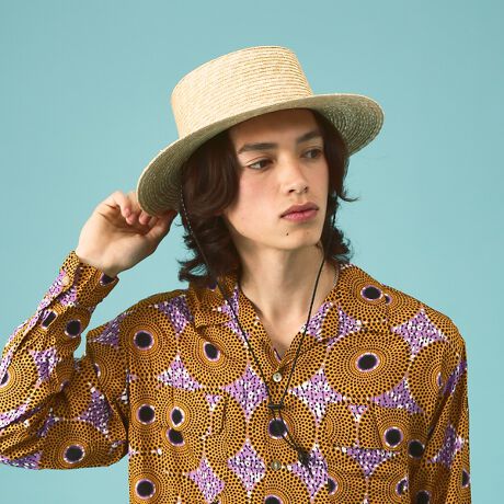 クールなロングブリムに、あえて顎紐ディティールを加えたカンカンハットは抜群の雰囲気。