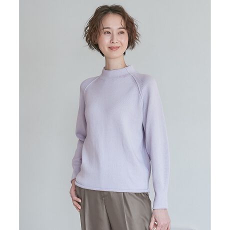 ■デザイン丸みのあるシルエットがポイントのモックネックニット。裾と袖口は身頃と同じ組織のままの編み出しで自然に外側にロールする仕様に。また脇線と袖は丸みをつけたシルエットで、カジュアルになりがちな綿ミドルゲージニットに、フェミニンな要素を取り入れ、大人の女性が取り入れやすい仕上がりにしました。今年は衿元にスカーフを巻いてアクセントをつけることスタイリングがおすすめです。■素材綿とポリエステルの混紡糸をオリジナルでコード撚りした素材です。コードにすることによってふくらみを残しつつも軽く仕上がり、編むとすっきりとした表情が生まれ、目が立ちます。毛羽が少なく、シャリ感があるのも特徴です。■同素材アイテムVネックニット(KRWMSS0255)