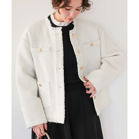 ・トレンドのツイード素材を使用したジャケット。・オンオフ兼用で着用可能な万能アイテム。・高見みえするゴールド釦がポイント。・程良いオーバーサイズで着用しやすい。・さっと羽織るだけでコーデを上品に仕上げます。[型番:ABXP3544]