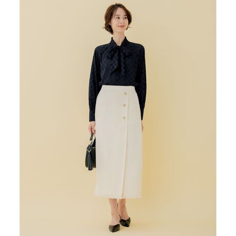 ■デザインスッキリとしたストレートシルエットのスカート。ラップスカート風のディティールでライトゴールドのメタル釦と裾の共フリンジがアクセントになり、シンプルながらも着映える1着です。■素材様々な種類の糸と複雑な組織で織り上げたブッチャー素材です。染色・織・仕上げまで国内の産地で拘って仕上げ、絶妙な立体感のある表情が今年らしいアイテム。ツイードのような表情がありながらも、強撚糸を使用することでスッキリとしたタッチと見た目よりも軽い風合いが特徴です。■同素材アイテムワンピース(OPWMSS0202)パンツ(PRWMSS0202)ジレ(VRWMSS0202)ジャケット(JKWMSS0202)