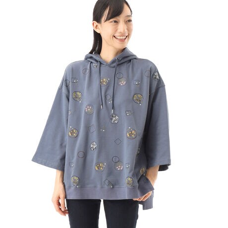 適度な厚さのコットンポリエステル裏毛を使用したパーカ。ゆったりとしたサイズのフード付きのプルオーバーは、7分丈のゆったりとした袖なので一枚ではもちろん、中にレイヤードして袖口からインナーを見せるスタイリングがおすすめです。シャボン玉のようなリング状のドットに小さなお花が可愛らしい総刺繍を施しました。