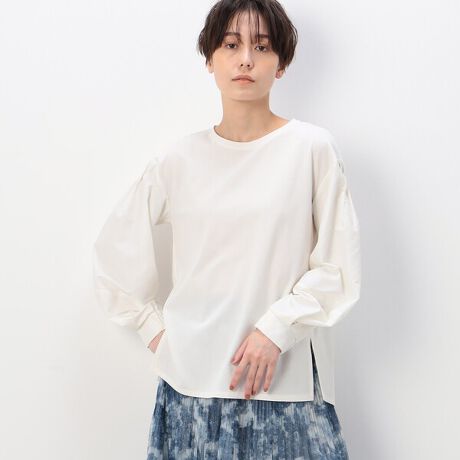 肩に入れたピンタックから、袖に向かってコクーン調なデザインが着た時に、ふんわりと女性らしいシルエットになっています。