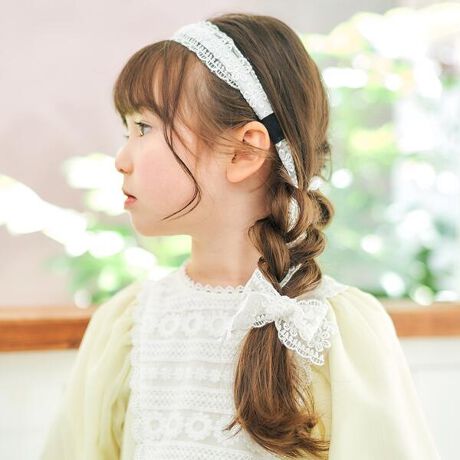 【Ma cherie】女の子にとっていつもよりちょっぴり背伸びした記念日をアプレレクールが提案する「Ma cherie(マシェリ)」チュールに刺繍をしたような華やかなレースを使ったカチューシャ。カチューシャの先には長めのリボンが付いているので、首の後ろでリボン結びしたり、髪と一緒に編み込んだりとアレンジは自由♪