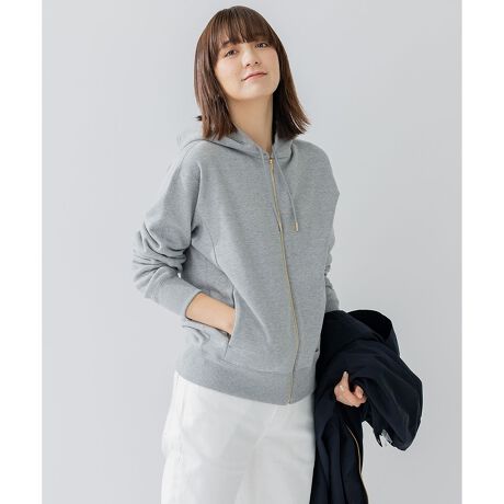 カジュアルスタイルに欠かせないジップアップフーディー。肩回りの前身頃はドロップショルダーに、後ろはラグランにしたなじみの良いシルエットです。ポケットはスリットになっており主張しすぎないので 上品に軽く羽織るアイテムとしても合わせやすく、ウエストもすっきり見えます。ベーシックなアイテムですがファスナーやメタルパーツはゴールドでクラシカルなイメージに。ロゴ刻印の入ったパーツは、ベーシックアイテムをアップグレードしてくれます。春らしいマリンパンツと合わせたり、デニムやダンガリーと合わせたり、トレンチコートのインナーにもオススメの、長く活躍するアイテムです。カラーは、こなれ感の出るホワイト(#001)、シックなネイビー(#075)、定番のライトグレー(#003)の3色展開です。