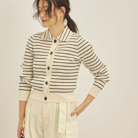 体のラインを拾いすぎない、程良い肉感の、ランダムリブポロカーディガン。