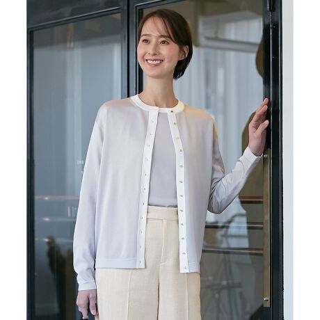 ■デザイン素材の持つ上品な光沢感をいかしたカーディガン。編み出しにリブを使わず、脇線と袖下線をストレートラインで仕上げています。小さく華奢なメタル釦は間隔を狭めて配置し、明彩度の近いカラーを配色で衿と前立てに組み合わせた、単品使いでも華やかな1着です。■素材ハリコシのあるアセテートにソフトな風合いのポリエステルを特殊な加工で撚り合わせ、シルキーで清涼感のある素材を使用。肌触りの良い繊細なコットンを裏にプレーティングして程よい