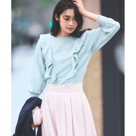 ■デザイン縦に流れるようにとった大胆なラッフルとボリューミーな袖のコンパクトな着丈が魅力のデザインプルオーバー。スカート合わせに相性抜群な丈感に仕上げました。スタイルアップして見えるシルエットを追求し、ウェストのリブ巾を長めにすることでウェスト位置を高く見せ、ギャザー分量をたっぷりと持たせることでメリハリのあるラインを実現。横から見ても曲線的で女性らしい柔らかな印象に。衿元の始末は、あえて付属を付けないことで抜け感をプラスしています。一枚着るだけで華やぐニットは、フレアスカートやプリーツスカートに合わせるだけで、即今どきスタイリングが完成します。