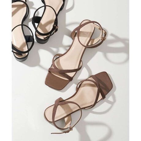 細幅のクロスストラップサンダルが女性らしく、太めヒールで安定感もあるのでシンプルな飽きのこないデザインです。