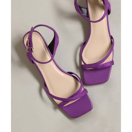 細幅のクロスストラップサンダルが女性らしく、太めヒールで安定感もあるのでシンプルな飽きのこないデザインです。