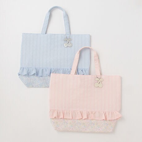 フリルのアクセントが可愛いレッスンバッグです。チェリーモチーフのチャームと総柄パターンの切り替えでデザインポイントを効かせました。習い事や授業の移動など、さまざまなシーンに大活躍。内ポケットつきで、大事なものを分けてしまえるのもうれしいところです。内側にループを備えており、学校机の横にかけても床につきにくく仕上げました。≪重さ≫F/約136g