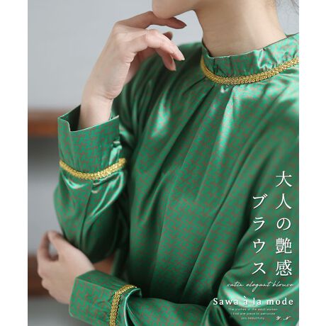 【ブラウス】トップス シャツ 緑 グリーン 長袖 サテン ハイネック 刺繍 タック エレガント 冬服