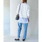 ・グリーンはホワイト系ボトムなら春らしい爽やかコーデに。