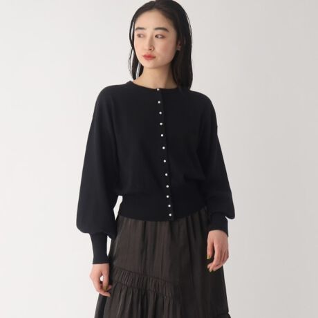 ・クルーネックのニットカーディガンに、小さめのパール調釦をたくさん付けてポイントにしたデザイン。