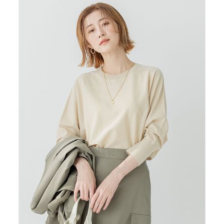 ストレッチポリエステルを芯にソフトな風合いで光沢感が有るテンセルを巻いたコアスパン糸という素材を使用。着心地の良さはもちろん、表面の適度な光沢感が美しい1枚に仕上がりました。テンセルはLENZING(レンチング)社のこだわりの原料で、環境にやさしいサステナブル素材です。ピリング性が良く毛玉になりにくい素材です。