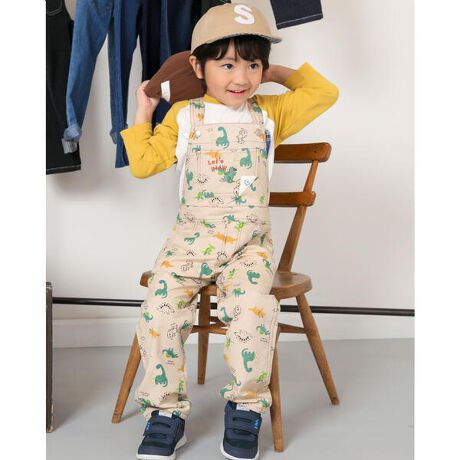 カラフルな恐竜の総柄がインパクトのあるサロペット。