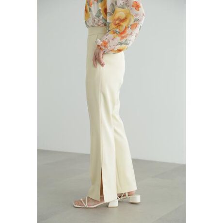 ポリエステルレーヨンのストレッチ素材を使用したフレアパンツハイウエストでシルエットがキレイに見えるように腰からヒップは細めに、膝から裾にかけてフレアがキレイに見えるデザインです。裾はサイドスリットをいれ、足元に抜け感をだしています。タイプライターボリュームブラウス(店舗品番092-3110029)やアートフラワープリントブラウス(店舗品番092-3110011)とのコーディネートがオススメです。夏はタンクトップやTシャツとあわせたラフな装いも楽しめます。