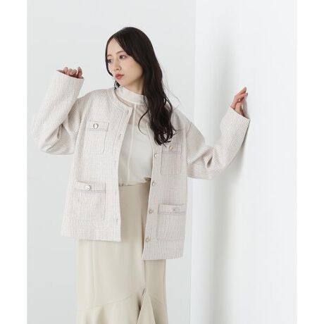 品の良いクラシカルなツイード素材で仕立てたノーカラージャケット。肩のラインをさげたドロップショルダーのオーバーサイズシルエットで、気負いなくカジュアルに羽織れる一着。ポケットに施されたブレードとメタルボタンの装飾がアクセントになります。腰が隠れるミドル丈は、パンツでもスカートでも合わせやすく春にぴったりのアウターです。※撮影時照明の関係により、色味が違って見える場合がございます。またパソコン・スマートフォンなどの環境により、若干製品と画像のカラーが異なる場合もございます。予めご了承ください。商品の色味は、商品単品画像をご参照下さい。※商品画像はサンプルのため、色味やサイズ等の仕様に変更がある場合がございますので、予めご了承ください。