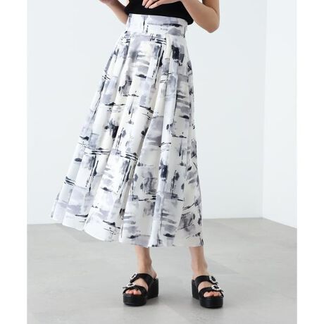 光の反射をイメージしたジルバイオリジナルプリントが着映えるスカート。微光沢の軽い素材をふんだんに使用しており、歩くと揺れるシルエットが綺麗な一枚。幅広で切り替えたウエストラインはトップスをインすると、スタイルアップを狙えるデザインです。シアーシャツ合わせもトレンド感がありオススメです。※撮影時照明の関係により、色味が違って見える場合がございます。またパソコン・スマートフォンなどの環境により、若干製品と画像のカラーが異なる場合もございます。予めご了承ください。商品の色味は、商品単品画像をご参照下さい。※商品画像はサンプルのため、色味やサイズ等の仕様に変更がある場合がございますので、予めご了承ください。