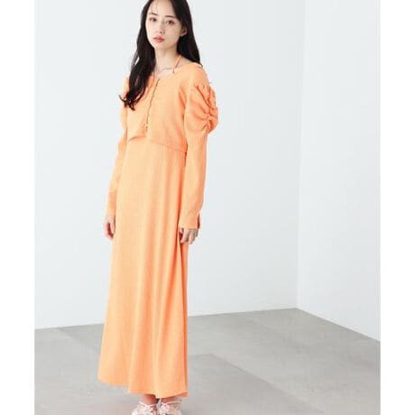 短丈カーディガンとノースリーブワンピースセットアイテム。表面が凹凸した伸縮性のある素材を使用、明るいカラーも魅力。着丈の短いカーディガンは、肩と背面にギャザーデザインと袖口スリットがポイント。ノースリーブワンピースは、華奢な紐使いでデコルテラインをほっそり見せてくれます。2点レイヤードで着ていただくと、脚長効果が期待できます。※撮影時照明の関係により、色味が違って見える場合がございます。またパソコン・スマートフォンなどの環境により、若干製品と画像のカラーが異なる場合もございます。予めご了承ください。商品の色味は、商品単品画像をご参照下さい。※商品画像はサンプルのため、色味やサイズ等の仕様に変更がある場合がございますので、予めご了承ください。