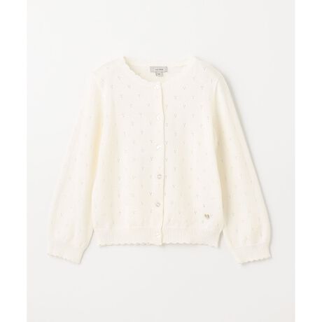 アイレット入りの、ニットカーディガン。首元、袖、裾のスカラップデザインも相まって、コーディネートを上品な印象に仕上げてくれます。セレモニー用のワンピースなどにはもちろん、デイリーなアイテムにも合わせられます。ハート型のチャームがかわいいポイント♪一枚持っておくと活躍すること間違いなしのアイテムです。