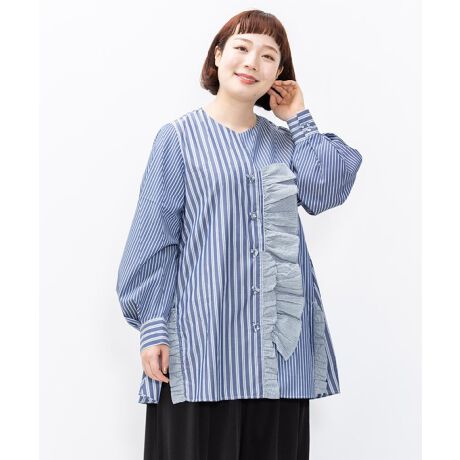 ◆ ストライプを効果的に組み合わせたフリルシャツ(大きいサイズ ◆ピッチや素材の違ったストライプ生地を組み合わせたノーカラーのシャツです。前端やスリット明きには フリルが付いますが 更に前釦にセット出来る取り外し可能なフリルも付いています。袖口に沢山入ったタックは 程よくハリ感のある素材によりボリュームをキレイに出してくれます。前開きや袖開きには 大きさの違った飾り釦を付けてポイントにしています。Olaca model:H164 B94 W82 H103 *3サイズ着用▲着画画像の商品はサンプルを使用しておりますので 色味、仕様、加工、サイズ、素材等が若干異なる場合がございます。▲実際の商品は詳細画像をご覧ください。《お取り扱いについて》・着用またはお取り扱いの際は、アテンションタグや洗濯ネームを必ずご確認ください。《注意事項》※商品の色や質感をできるだけ忠実に再現するよう心がけていますが、撮影場所やお使いのモニター環境により、実物と若干異なる場合がございます。予めご了承ください。※写真を許可無くコピー・転用することは固くお断りします。