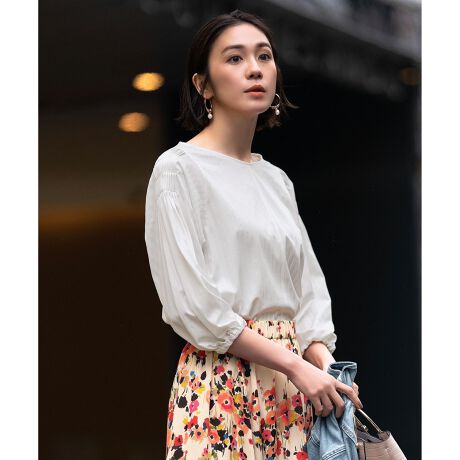 ■デザインカジュアルで春らしいカラーリングのストライプがポイントのブラウス。肩には印象的なタックディティール、程よいネックの開きと袖の分量がデコルテ周りを華奢に見せてくれます。■素材毛羽を極限まで抑えた超長綿をポリエステルと交編して編みたてたジャージー素材です。オリジナルの編み針で編み上げる熟練の技術により、ハイゲージでの編立、度詰めを実現し布帛のような目面に仕上がっています。ジャージー素材ならではのストレッチ性や肌離れの良さ、イージーケアやシワになりにくい点が魅力的な素材です。
