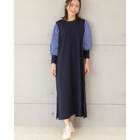 袖ストライプカットソードッキングワンピース