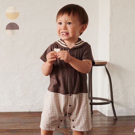 人気のセーラーカラー、セーラー衿のTシャツにギンガムチェック柄のパンツ。1枚でコーディネートが楽しめる!異素材切替の前開きデザインの半袖Tオール、ロンパース。ナチュラルなカラーも可愛い!オフホワイト×イエロー、ブラウン×ベージュの2色展開。【アイテム】プレゼント ギフト 赤ちゃん服 ベビー服 贈り物 トップス ボトムス つなぎ カジュアル お洒落 オシャレ かわいい 可愛い 普段着 デイリーウェア お出かけ着 ロンパース トレーナーオール 子ども こども 男児 男の子 ボーイズ キッズ ベビーサイズ 幼稚園 保育園通園 2023年夏物新作 丸高衣料 白色 黄色 茶色 キッズズー コットン100% 綿100%