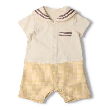 人気のセーラーカラー、セーラー衿のTシャツにギンガムチェック柄のパンツ。1枚でコーディネートが楽しめる!異素材切替の前開きデザインの半袖Tオール、ロンパース。ナチュラルなカラーも可愛い!オフホワイト×イエロー、ブラウン×ベージュの2色展開。【アイテム】プレゼント ギフト 赤ちゃん服 ベビー服 贈り物 トップス ボトムス つなぎ カジュアル お洒落 オシャレ かわいい 可愛い 普段着 デイリーウェア お出かけ着 ロンパース トレーナーオール 子ども こども 男児 男の子 ボーイズ キッズ ベビーサイズ 幼稚園 保育園通園 2023年夏物新作 丸高衣料 白色 黄色 茶色 キッズズー コットン100% 綿100%