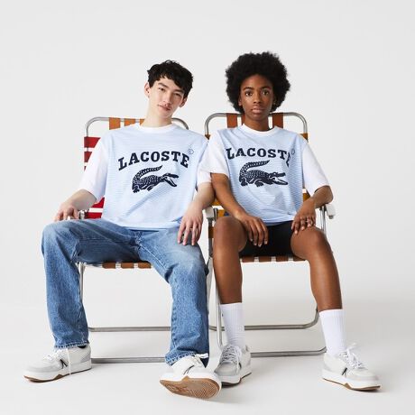 前後身頃をミニマルピッチのバイカラーボーダーで仕立てつつ、スリーブパネルは単色で切り替え。フロントには、オーバーサイズのネーム&ロゴグラフィックをプリント。昨今のストリートトレンドにもマッチするリラックスフィットシルエットも際立つ、爽やかな存在感がはじける1枚です。 Loose Fit