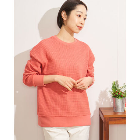 [型番:467J2404]ざっくり編みのニットをワッフル網にした素材で作ったプルオーバー。マリンコーデにぴったりなネイビーボーダーと明るい無地のオレンジ2色展開です。襟や袖口にはテレコを使用しています。