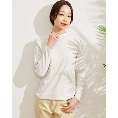 薄手のテレコ素材で作ったハイネックのトップス。軽くて薄いので季節の変わり目のインナーにおすすめ。顔まわりを明るく見せてくれるカラーがコーディネートのポイントになってくれます。