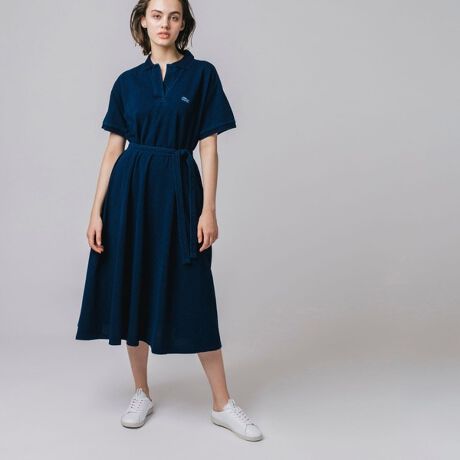 ラコステレディースラインナップの定番であるポロドレスを、ボタンレスのスキッパーネックデザインでアレンジ。ボディには、インディゴカラーの鹿の子素材を使用。ボリュームのあるマキシ丈のリラックスシルエットとの組み合わせで、フェミニンなヌケ感を演出する1枚です。ウェストには、着こなしの幅が広がる共地のベルト付き。