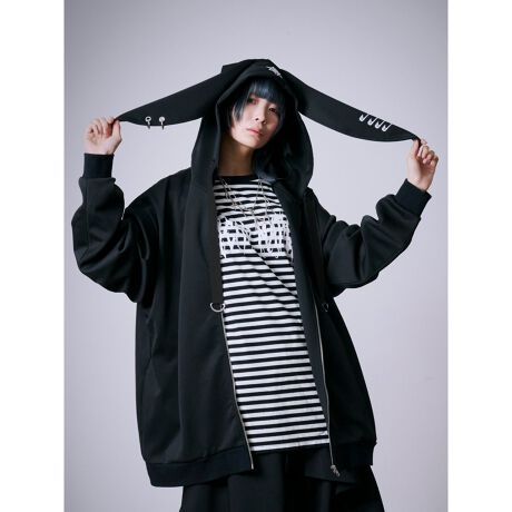 semantic design×PSYCHONATIONのコラボレーションアイテム。大きなうさ耳が目を引く、BIGシルエットのフルジップパーカーです。うさ耳につけた毒っ気のあるリングピアスと安全ピンでダークな世界観を表現しています。ロゴ入りのフードスピンドルや、先端にD管等、ディテールに凝った仕様になっています。脇ポケット付き。チェック柄のサルエルと合わせて、病み系ファッションでコーディネートするのがおすすめです。