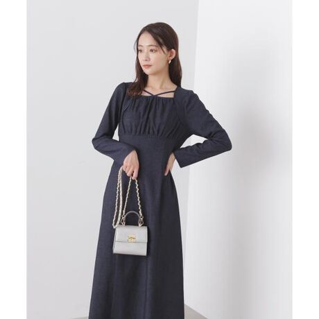 今シーズンらしいスクエアネックがポイントのワンピース。デコルテがすっきり見えるスクエアネックに共布のヒモをあわせて新鮮な着こなしに。また、肩まわりの切り替えデザインやパイピングがアクセントになります。ロングスリーブの袖口にはスリットをいれ、手首に抜け感をプラス。シンプルなデザインながら、腰高の切り替えでスタイルアップを期待できるのも魅力の一枚。