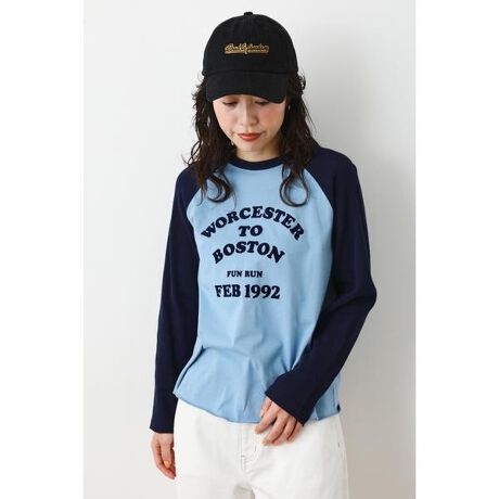 ワッフル素材の配色が可愛いラグランロンT。体に丁度良くフィットするサイズ感でジャケットなどの上着を羽織ってもごわつかないのがポイント。プリントがフロッキーになっており、遊び心のある一枚です。
