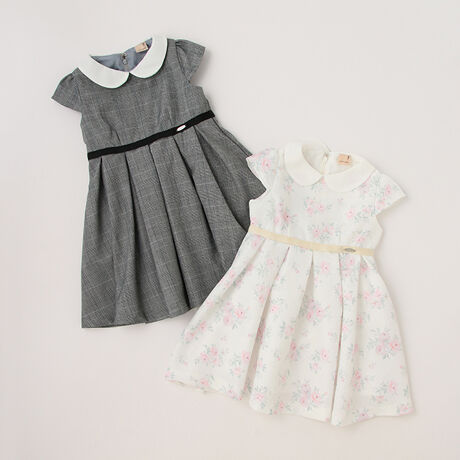 発表会やパーティーシーンにぴったりの衿つきワンピースです。ウエスト位置からプリーツをほどこし、フレアなシルエットに仕上げました。きちんと感がただよいつつ、柄パターンがシーンに合わせた雰囲気を演出。オフホワイトはハレの日に、グレーは入卒園式など、着用する場に合わせてカラーを選ぶのもおすすめです。【おすすめの着用時期は春夏シーズン】【透け感】透けない【生地の厚さ】普通【伸縮性】なし【裏地】あり【ポケット】なし【アジャスター】なし