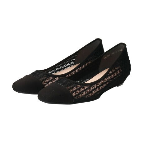 繊細なレースチュール生地をアッパーに使用し異素材とのコンビネーションで日常使いしやすくデザインされたエレガントパンプス。2.5cmの安定感のあるウエッジソールでフラット過ぎず足長効果も!コーディネートのポイントになること間違いなしです。