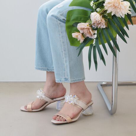 甲のベルト部分に華やかな飾りがついた夏らしいサンダル。PVC素材とクリアヒールで透明感のある足元を演出します。