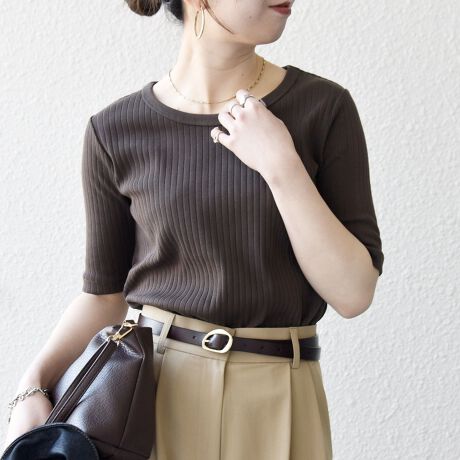 デコルテラインがすっきりと見えるクルーネックをセレクト。